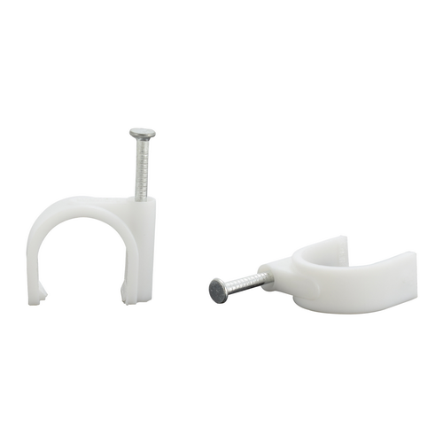 Поставляется в комплекте с уже вставленным гвоздем. Материал изготовления скобы гибкий самозатухающий ударопрочный полипропилен без галогенов. Материал изготовления гвоздя закаленная оцинкованная сталь, не подвергается коррозии.