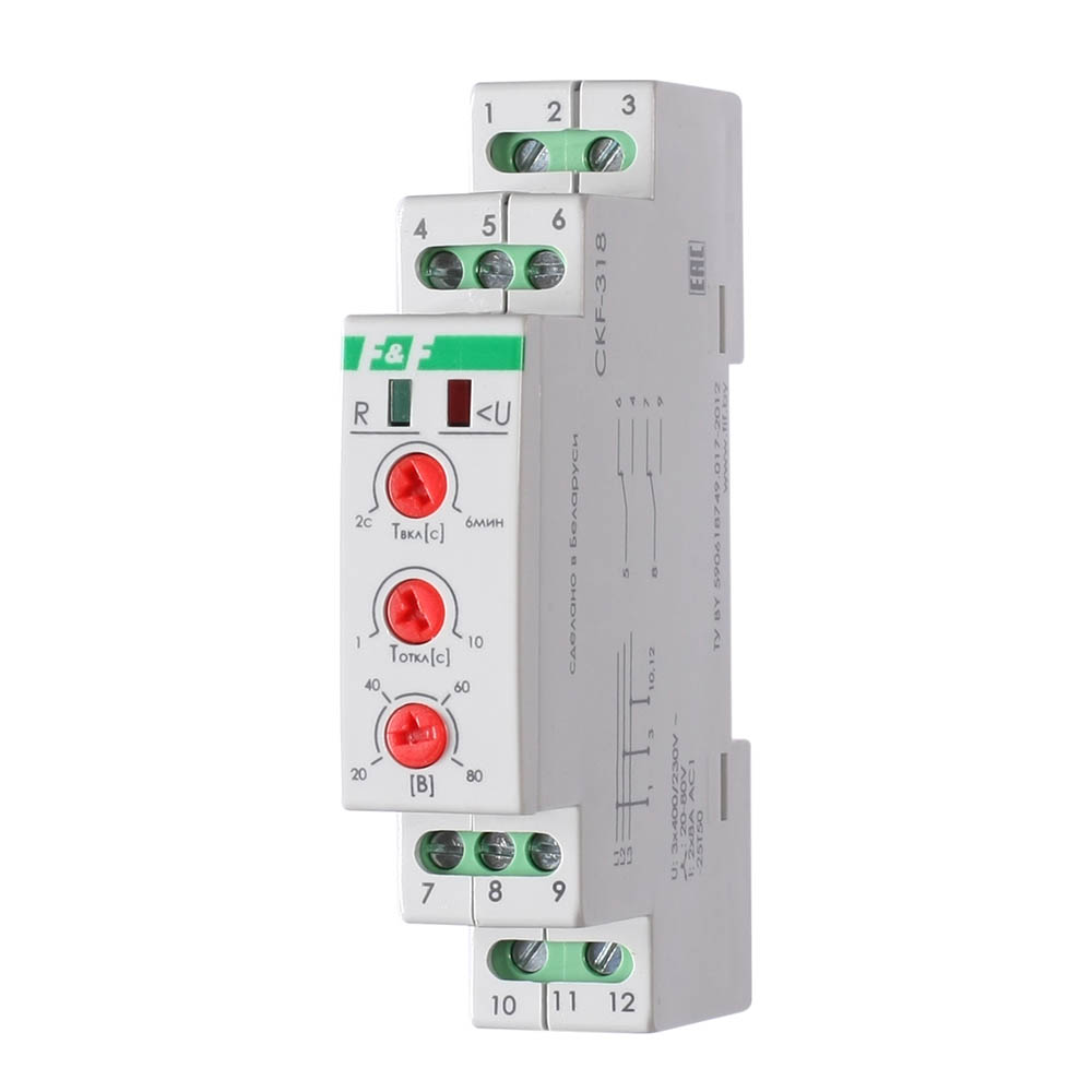 Если напряжение в пределах нормы, контакты исполнительного реле замкнуты и на контактор управления электродвигателем подается напряжение, управляющее его включением. В случае одной из вышеперечисленных аварийных ситуаций контакты реле размыкаются и контактор отключается. Выключение в случае асимметрии напряжения происходит с задержкой 1-10 с. В случаях отсутствия хотя бы одной из фаз либо нарушения чередования фаз изделие выключается с задержкой 0,1 с, а в случаях превышения верхнего значения напряжения - 0,5 с, снижения напряжения - 5 с. Включение происходит автоматически после восстановления сетевого напряжения питания. CKF-318 защищает также от симметричного падения напряжения в фазах. Изделие работает без нулевого провода.