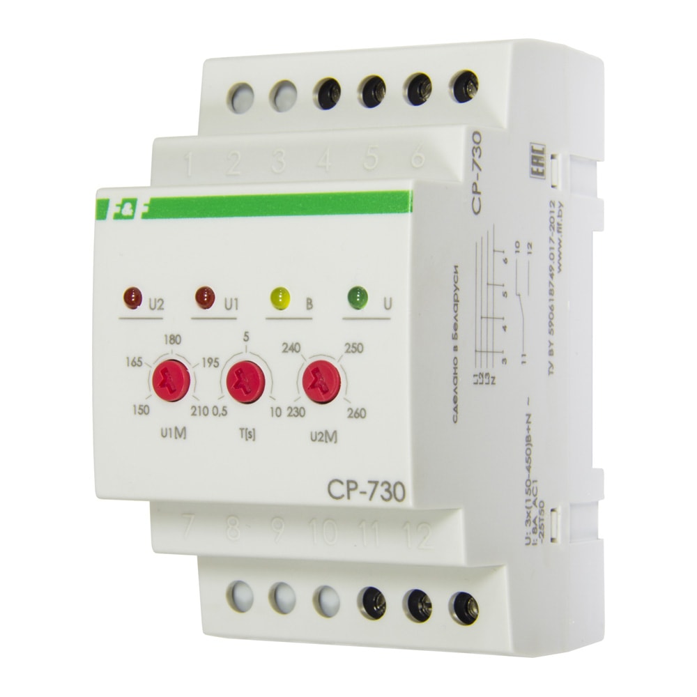 Реле напряжения CP-730 предназначены для непрерывного контроля величины напряжения в сети переменного тока в трехфазной сети и защиты электроустановок, электроприборов и т.п. путем отключения напряжения питания при выходе его за установленные пределы. СР-730 защищает также электроустановки при обрыве нулевого провода. Реле включено, если контролируемое напряжение находится в требуемом диапазоне. Диапазон (верхнее и нижнее значение) устанавливаетя с помощью потенциометров, расположенных на передней панели. При циклической нестабильности питания (выход напряжения питания за установленные пределы от 10 и более раз в течение минуты) реле отключает питание от потребителя на 10 минут. Включение реле происходит автоматически, после восстановления сетевого напряжения.