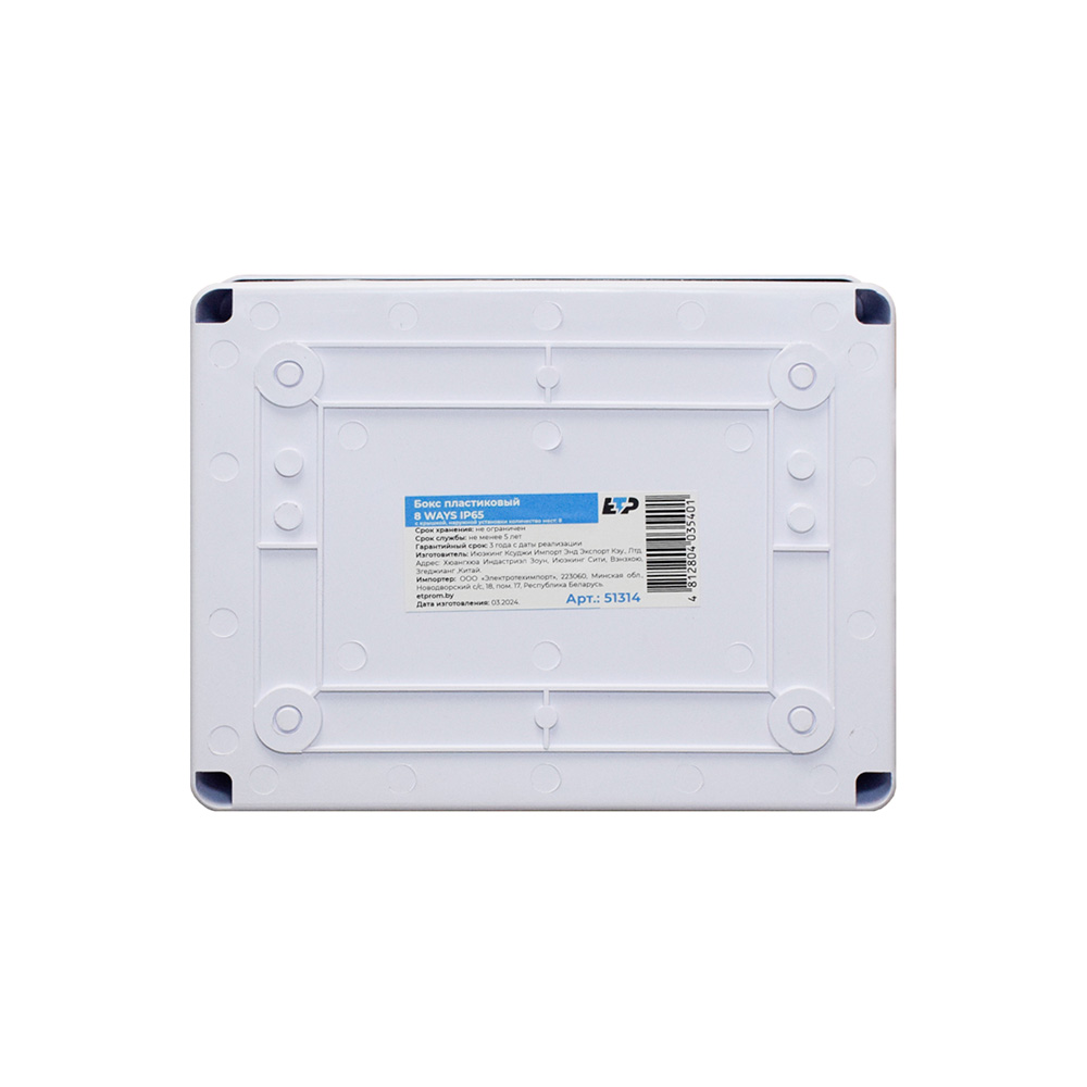 Бокс пластиковый 8Р WAY IP65 с крышкой ЕТР изготовлен из негорючего АБС-пластика, что позволит обезопасить вас при возникновении опасных и критических ситуаций в электросети. Ударопрочный и герметичный пластиковый корпус бокса продлевает срок службы модульного оборудования и защищает его от внешних воздействий, таких как брызги воды, пыль или удары.