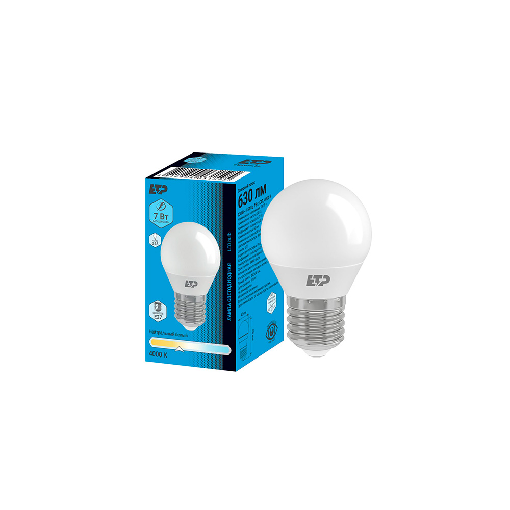 Лампа светодиодная G45 7W 4000K E27 ETP– светотехническое оборудование, в котором в качестве источника света выступают светодиоды (LED). Предназначены для освещения любых типов помещений, где соблюдены эксплуатационные требования по температуре и влажности. Могут применяться в светильниках любых типов, подходящих по размеру и цоколю. Светодиодное освещение является энергоэффективным и экологичным аналогом энергосберегающих люминесцентных источников света и ламп накаливания.