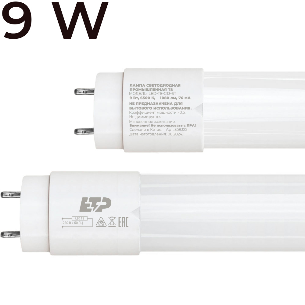 Светодиодная лампа T8 9W 6500K модели LED-T8-G13-ST ETP – современный источник света, успевший заслужить доверие покупателей, став улучшенным аналогом люминесцентной лампы. Представляет собой трубку 614мм из матового стекла, внутри которой расположены драйвер и светодиодная лента. Лампа T8 от ETP обеспечивает европейское качество, сочетая в себе доступную цену и отличные характеристики.