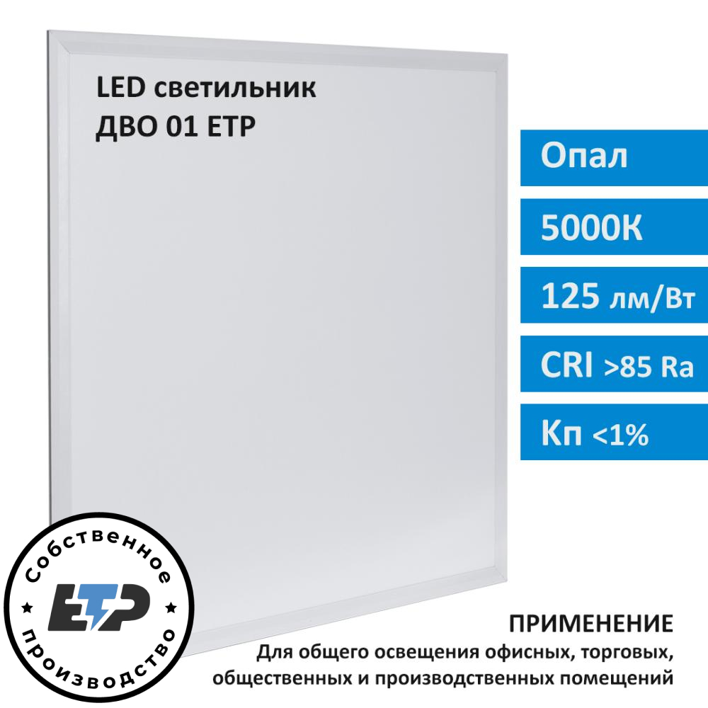 Светодиодная панель ДВО01-1х40х002 УХЛ4 ETP с цветовой температурой 5000К применяется для общего освещения в торговых залах, в офисных и общественных помещениях, в административных и производственных зданиях. Благодаря качественному драйверу с надёжными электрокомпонентами, наши светодиодные панели ДВО 01 ETP отлично подойдут для использований в кабинетах со сложными компьютеризированными устройствами: в медицинских центрах, различных лабораториях, исследовательских центрах, серверных комнатах и т.п..