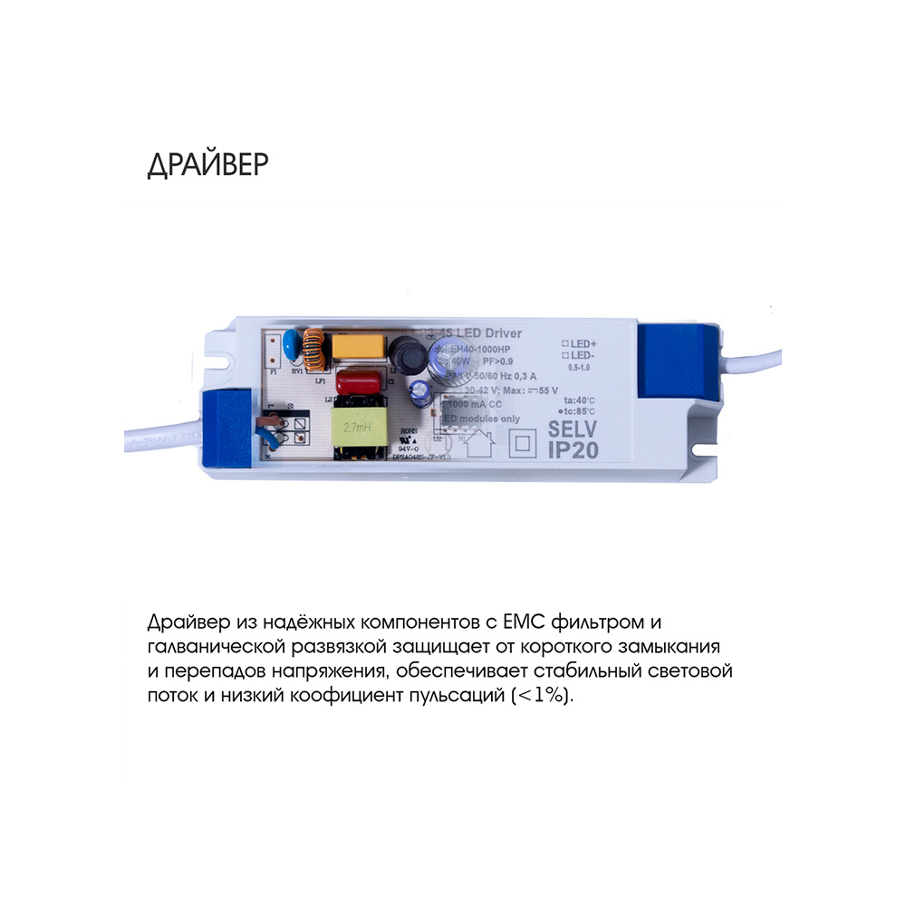 Драйвер Драйвер с EMC-фильтром и гальванической развязкой, надёжно защищает от короткого замыкания и перепадов напряжения, обеспечивает стабильный световой поток и низкий коэффициент пульсации (<1%). |