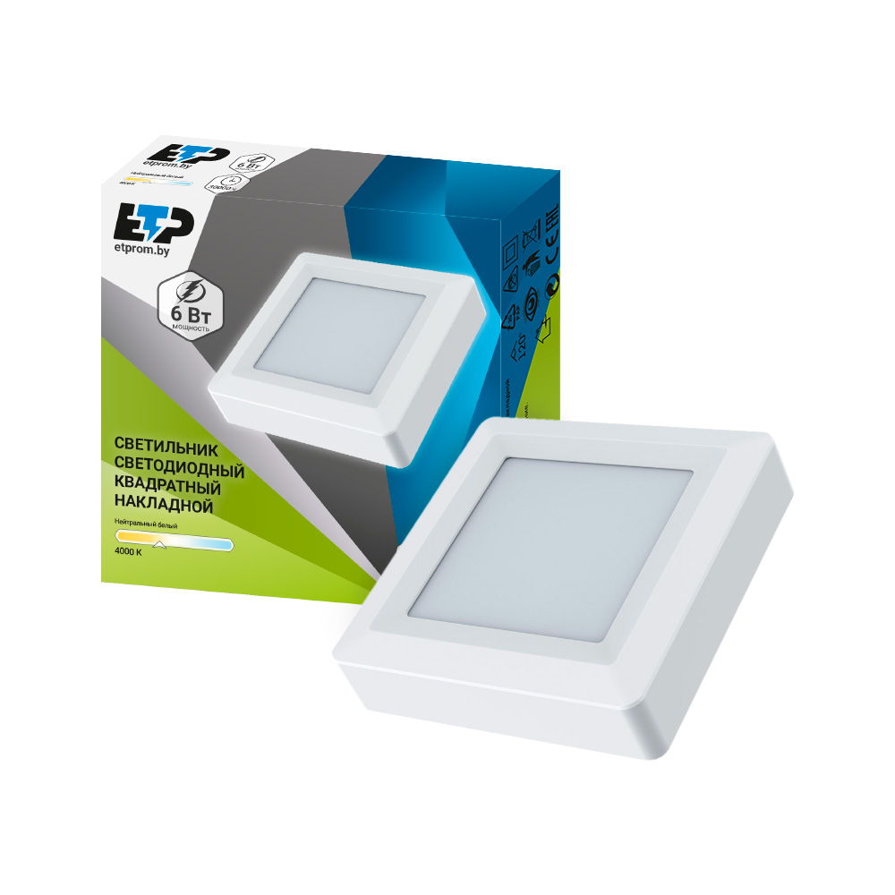 Накладной квадратный светодиодный светильник даунлайт ETP мощностью 6 Вт применяется для общего освещения небольших бытовых помещений и для местного освещения дизайнерских и архитектурных элементов интерьера. Легкий вес и удобный монтаж, позволяют использовать его на любых потолках.